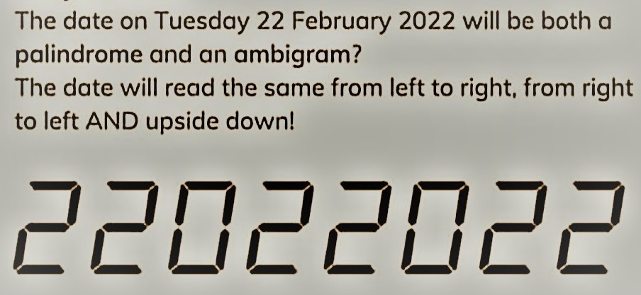 The date on Tuesday 22 February 2022 is unique. The date will read the same from left to right, from right to left, and upside down! 22022022