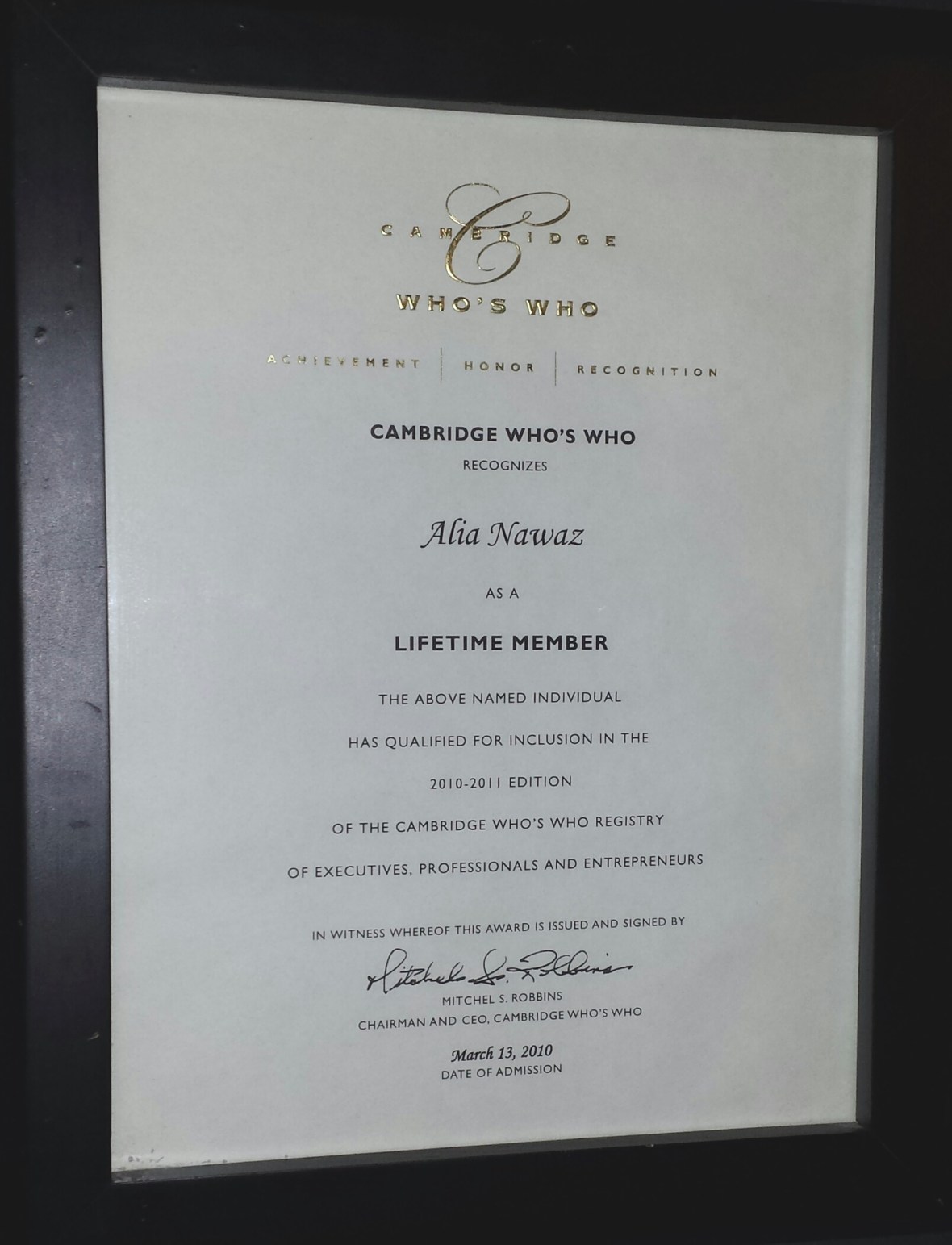 Selected “VIP member of the year” (2010-2011) in Cambridge who’s who, is recognized as a mark of Excellence Honour and Achievement” among Executives, Professionals and Entrepreneurs also inclusion in the directory