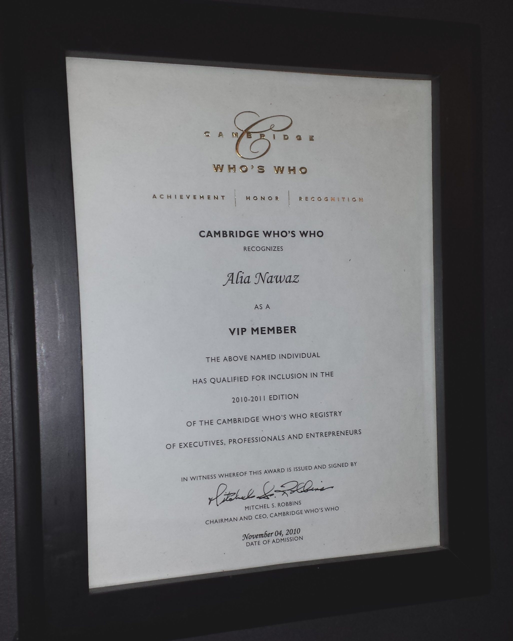 Cambridge Who’s Who “life time member” recognition; among Executives, Professionals and Entrepreneurs, and inclusion in the 2010-2011edition
