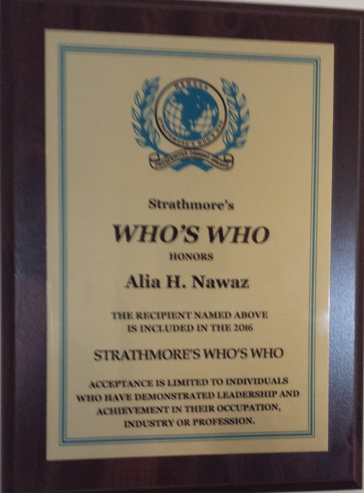 Honors to Alia H. Nawaz, her name is included in the 2016, Strathmore’s WHO’s WHO. Strathmore’s WHO’s WHO, acceptance is limited to individuals who have demonstrated Leadership and Achievement in their Professional occupation and Industry